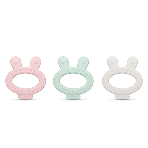 Silikonové kousátko ve tvaru králíčka s drobnými výstupky pro úlevu pro dětské dásně v praktickém boxu pro hygienickou přepravu. Evoluční kousátka jsou bezpečná, ergonomická, lehká a velmi zábavná.