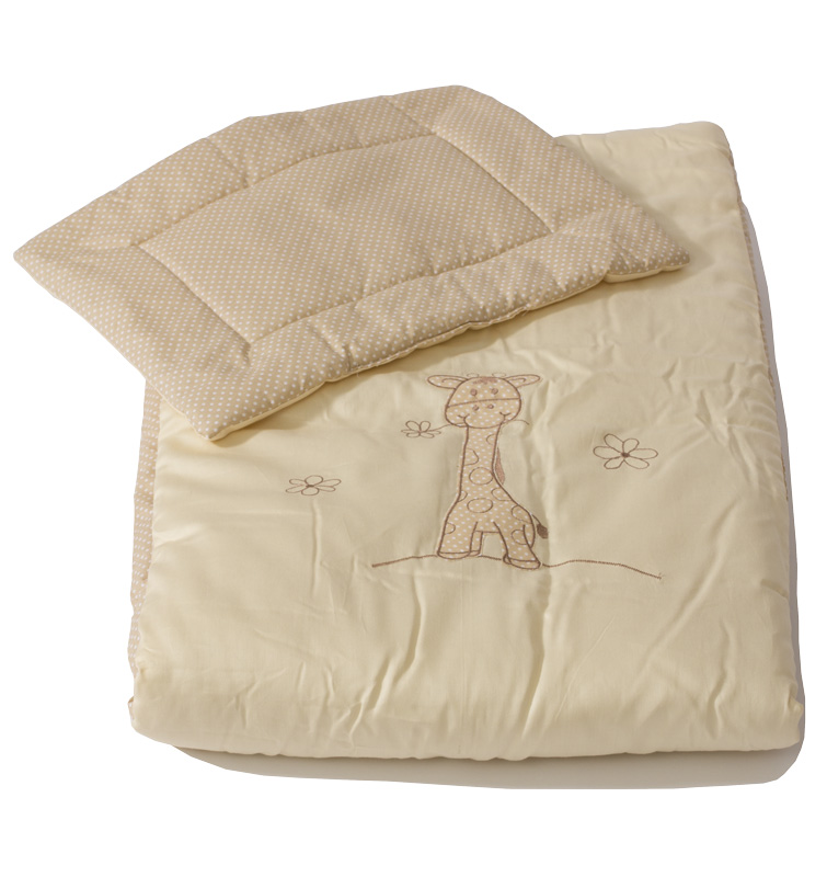 Prémiové sady polštářku a peřinky s výplní, polštářového mantinelu a nebes do dětských postýlek s velkou výšivkou žirafy Zoé.
