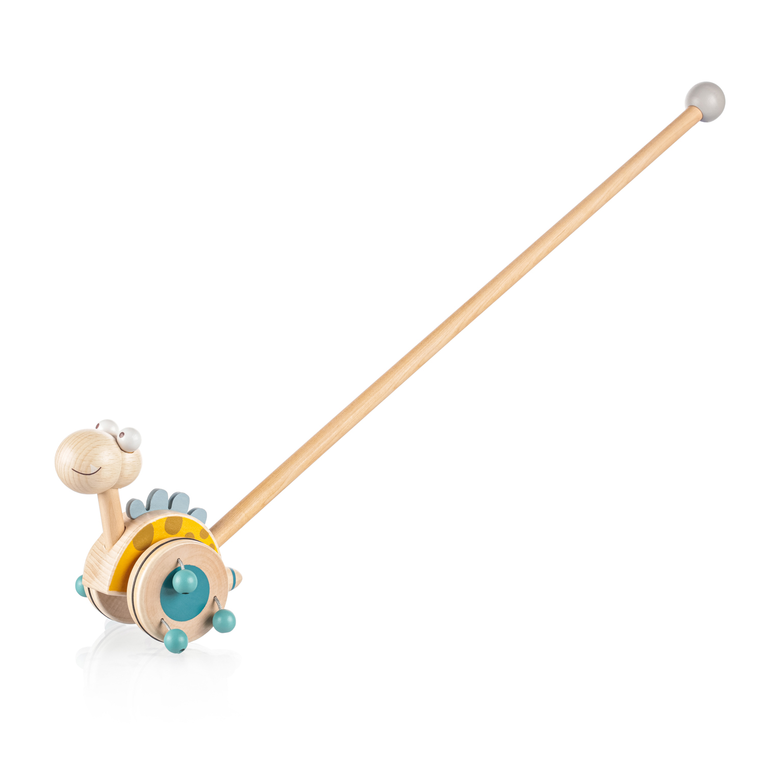 dinosaurus na dlouhé tyči se při pohybu točí a díky dřevěným korálkům