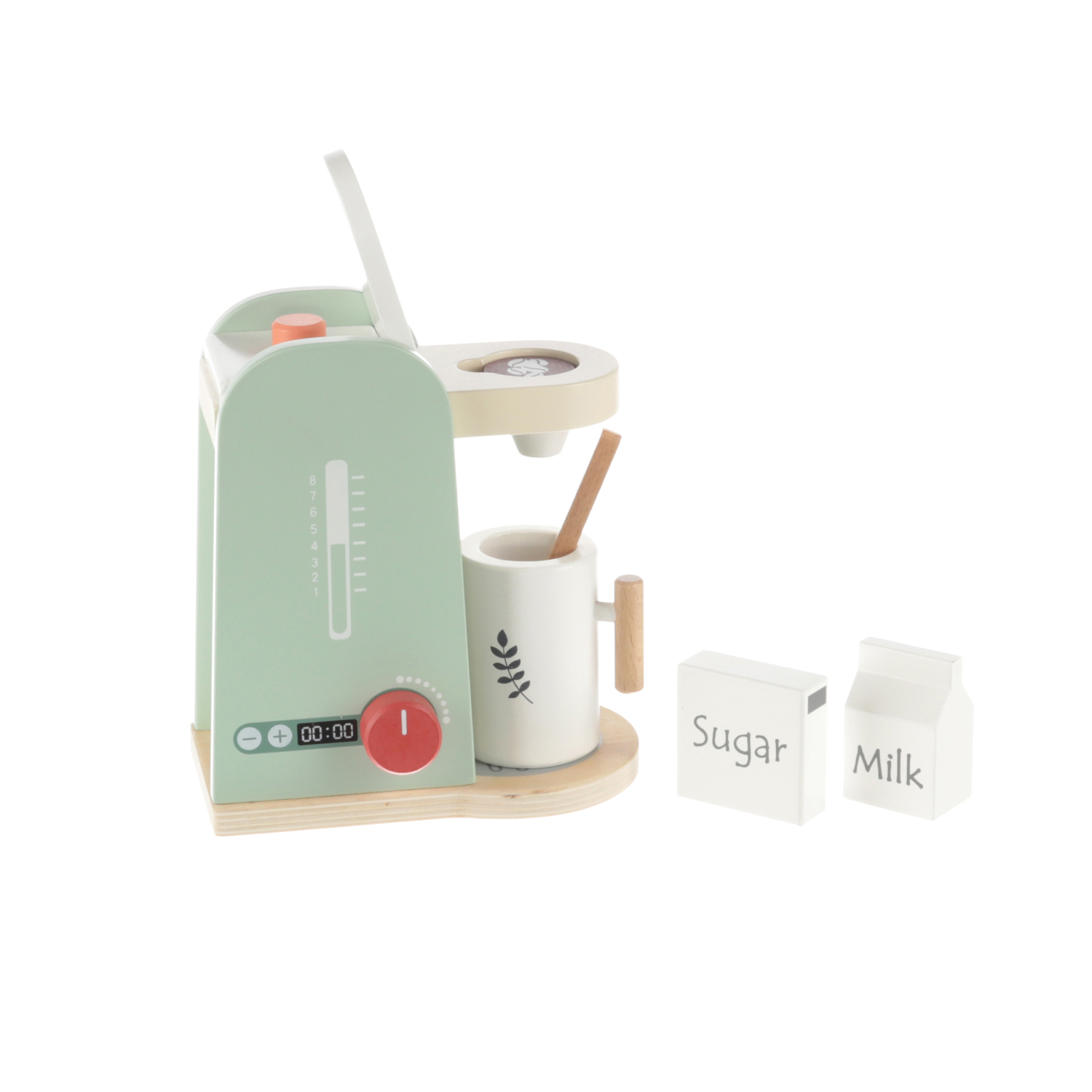 Součástí je velký dřevěný šálek se lžičkou a suroviny na přípravu kávy. Hračka
